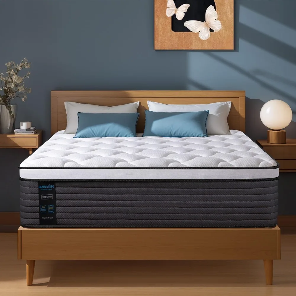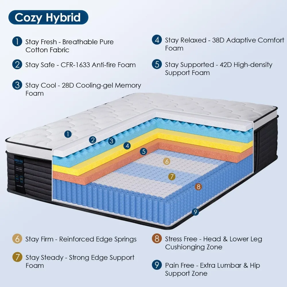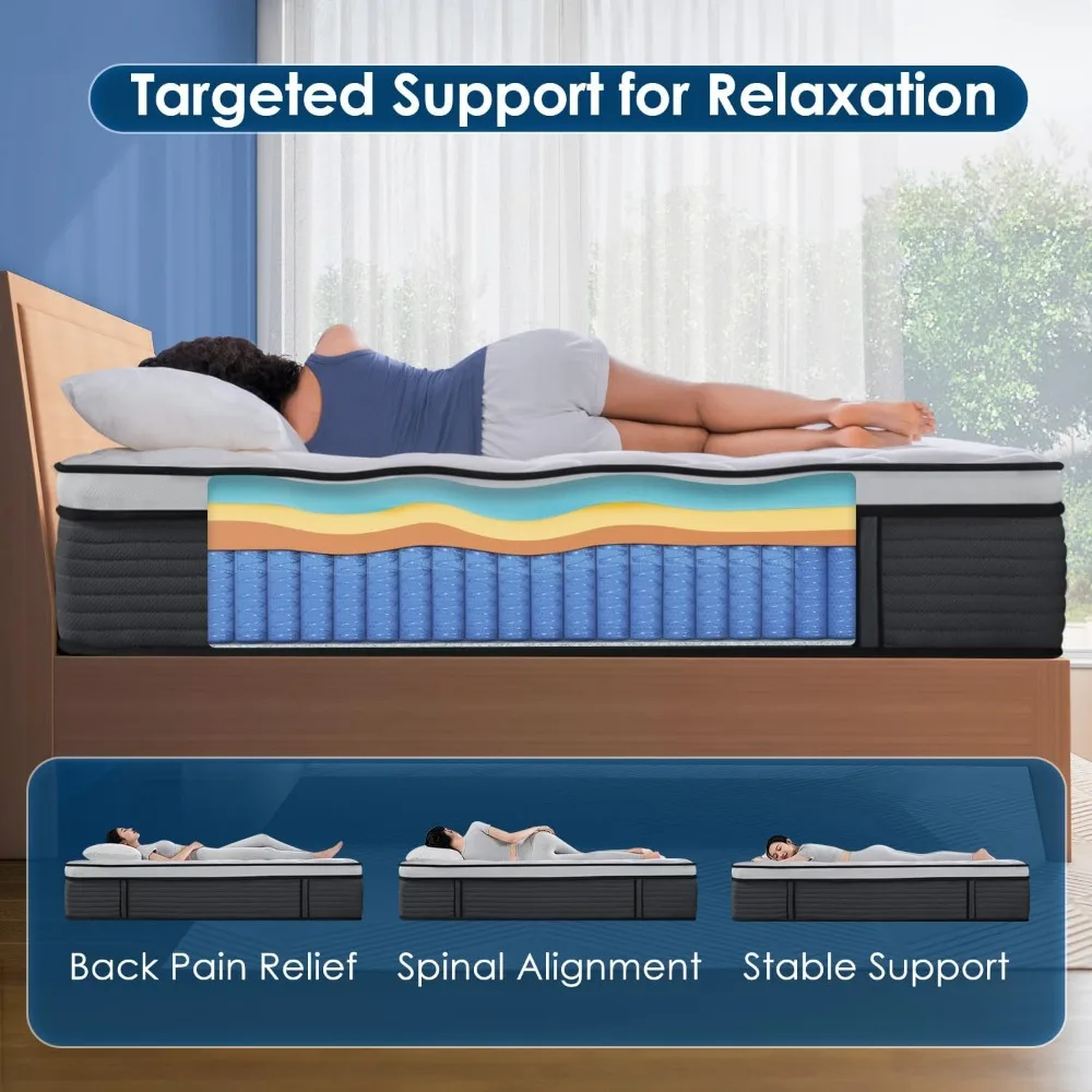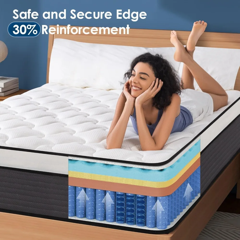 This 12-inch cooling hybrid mattress combines memory foam and pocket springs for ultimate comfort and support. The cooling layer regulates temperature, ensuring a comfortable sleep all night long. Medium-firm construction provides balanced support for proper spinal alignment. Pocket springs offer durability and enhanced motion isolation, reducing disturbances from a sleeping partner. Breathable materials improve airflow to maintain a fresh and cool sleeping surface. Perfect for all bed sizes, including twin, full, queen, and king. The mattress comes compressed in a mattress-in-a-box for convenient delivery and easy setup. Ergonomic design contours to the body, providing pressure relief and superior comfort.