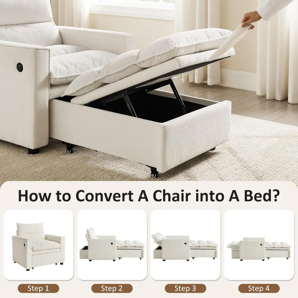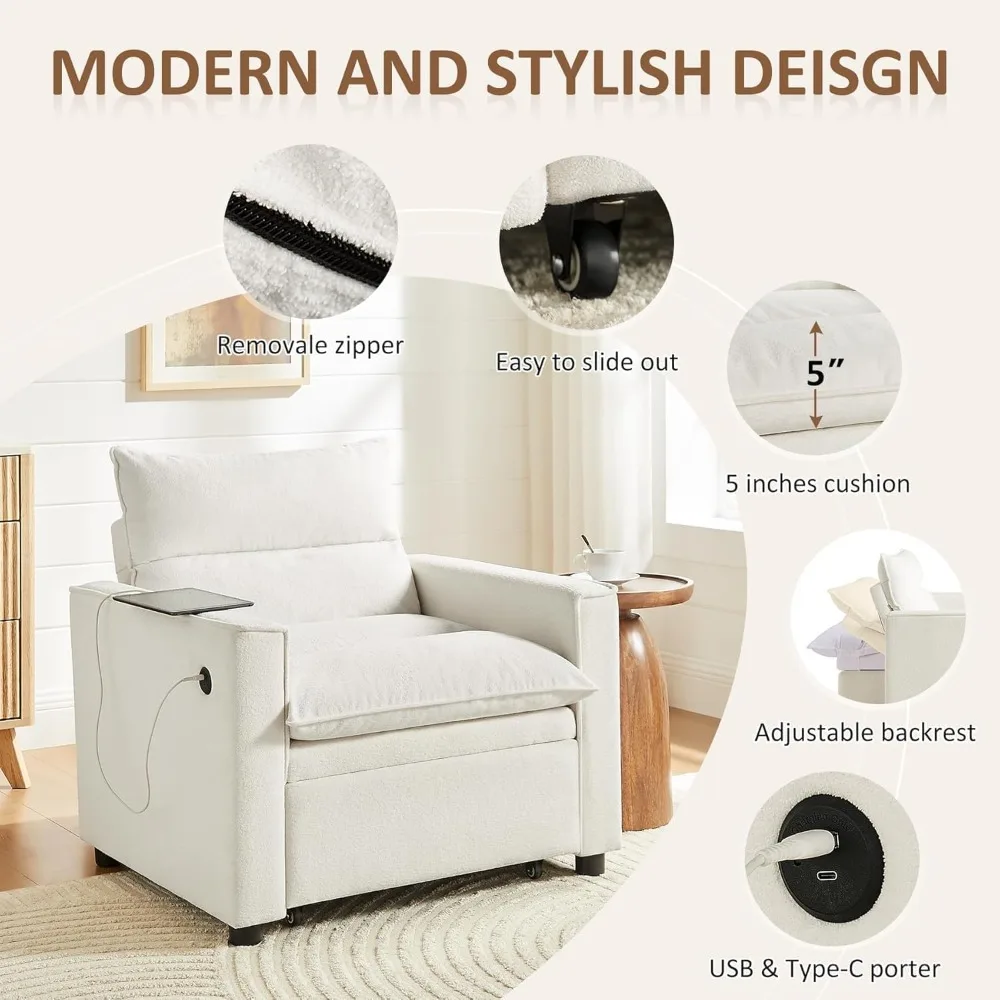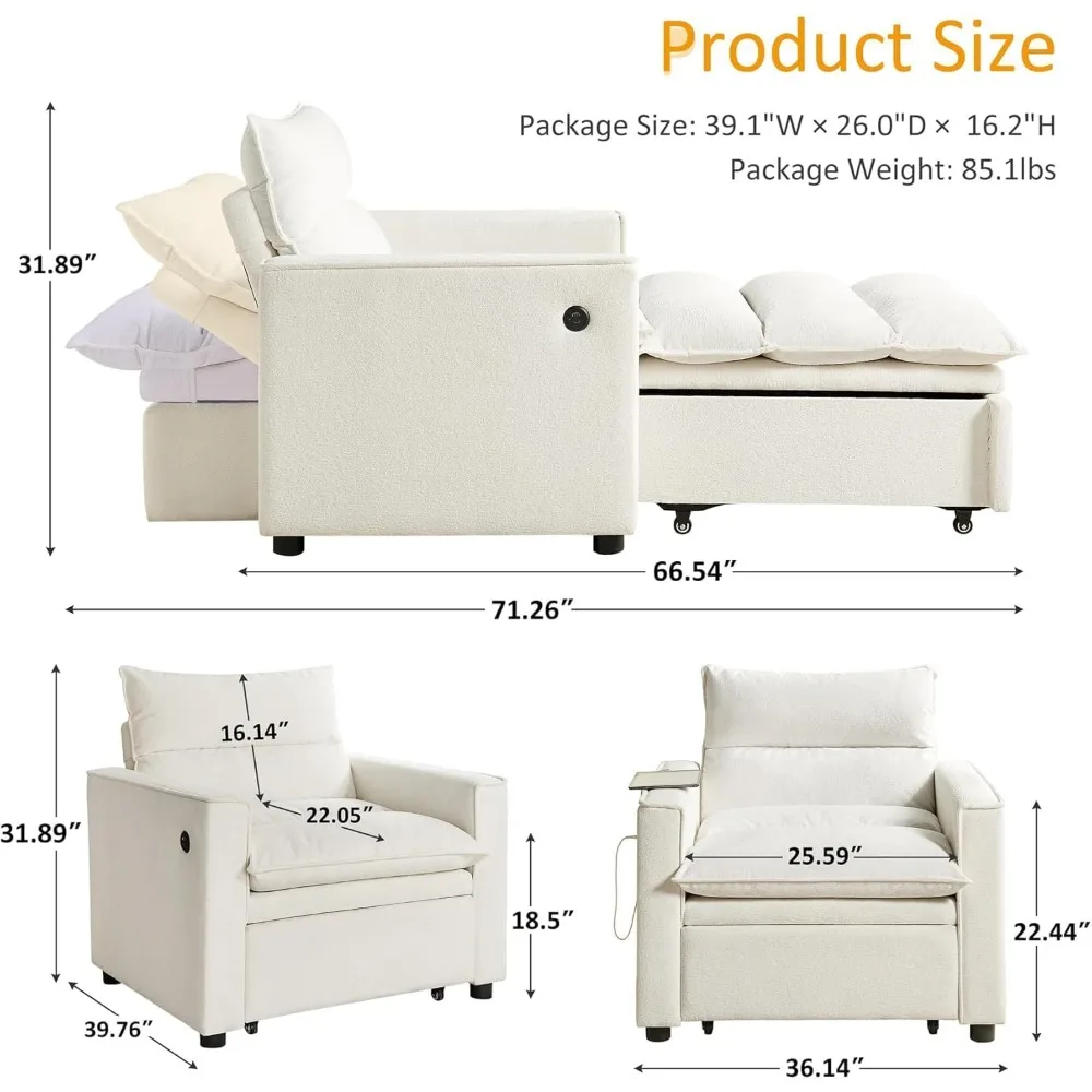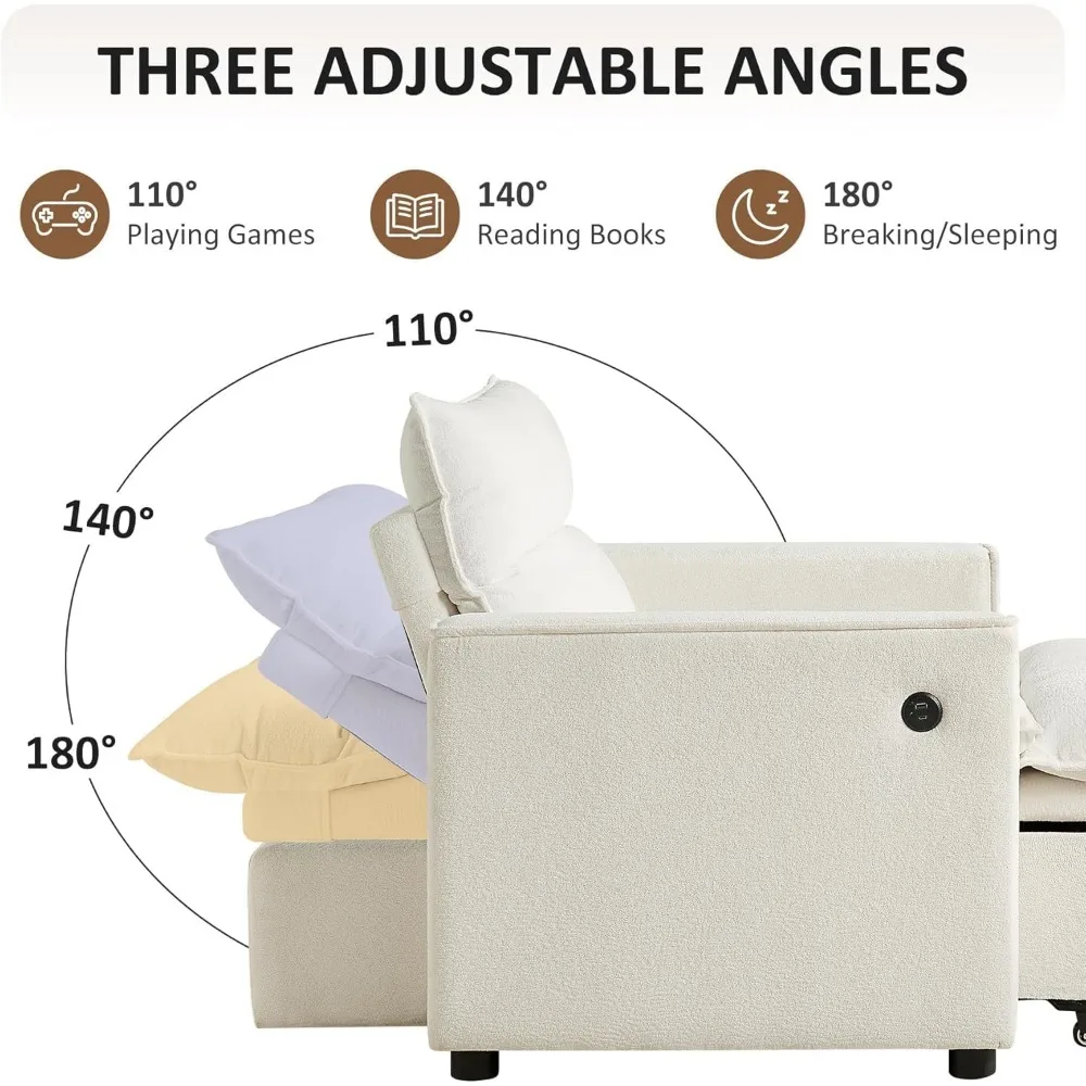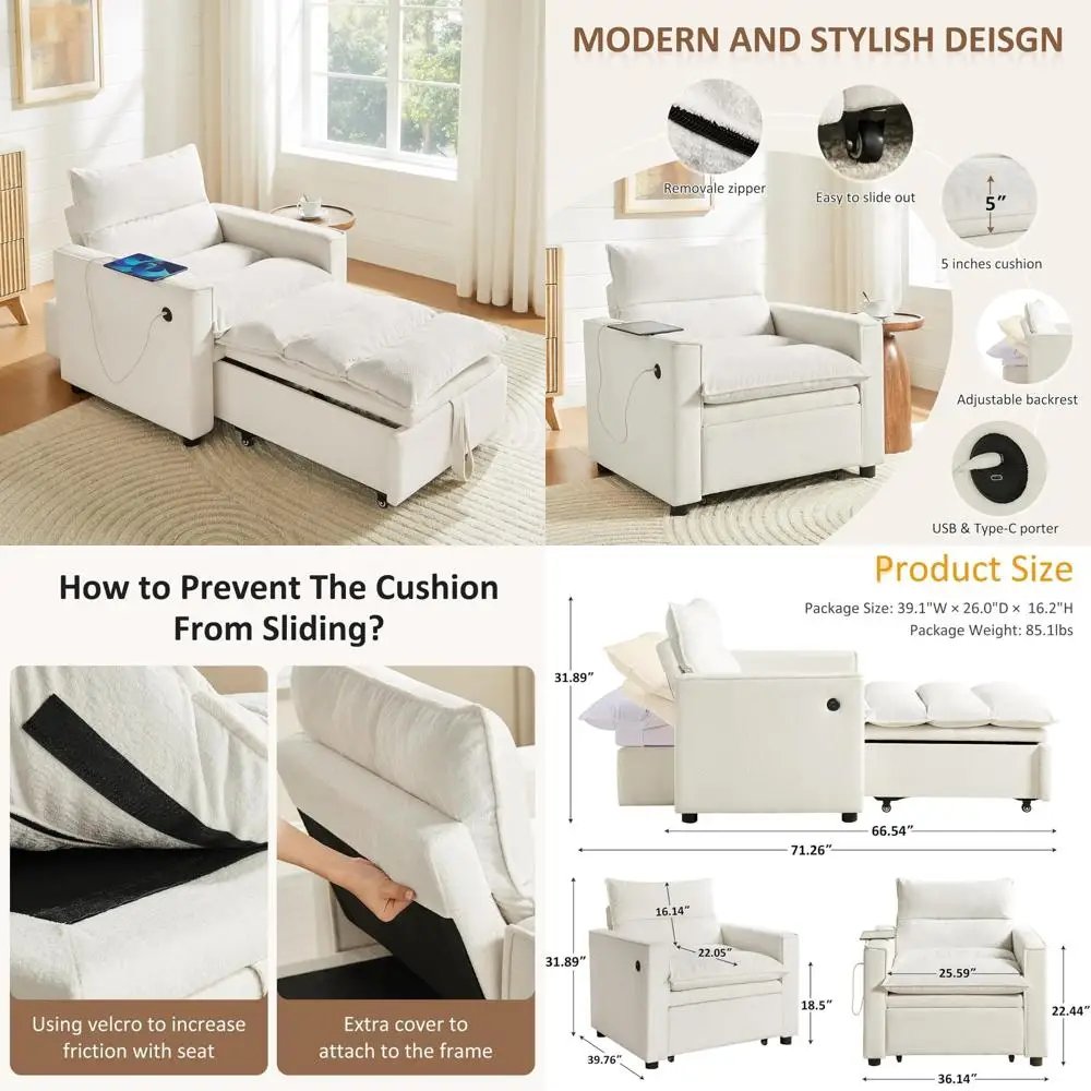 This 3-in-1 convertible futon sofa bed offers ultimate versatility and modern functionality for any living space. It easily transforms from a sofa to a bed or chaise lounge, providing flexible seating and sleeping options. Built-in USB and Type-C ports allow convenient device charging while relaxing. The pull-out chaise offers extended comfort for lounging or napping. Upholstered in durable, high-quality fabric, it combines style with long-lasting use. Compact yet spacious, it is ideal for apartments, living rooms, or guest rooms. Modern design and sleek lines complement contemporary décor styles. Sturdy construction ensures stability and durability for everyday use. Perfect for reading, working, watching TV, or hosting overnight guests. Combining practicality, comfort, and modern technology, this futon sofa enhances both functionality and style in your home.