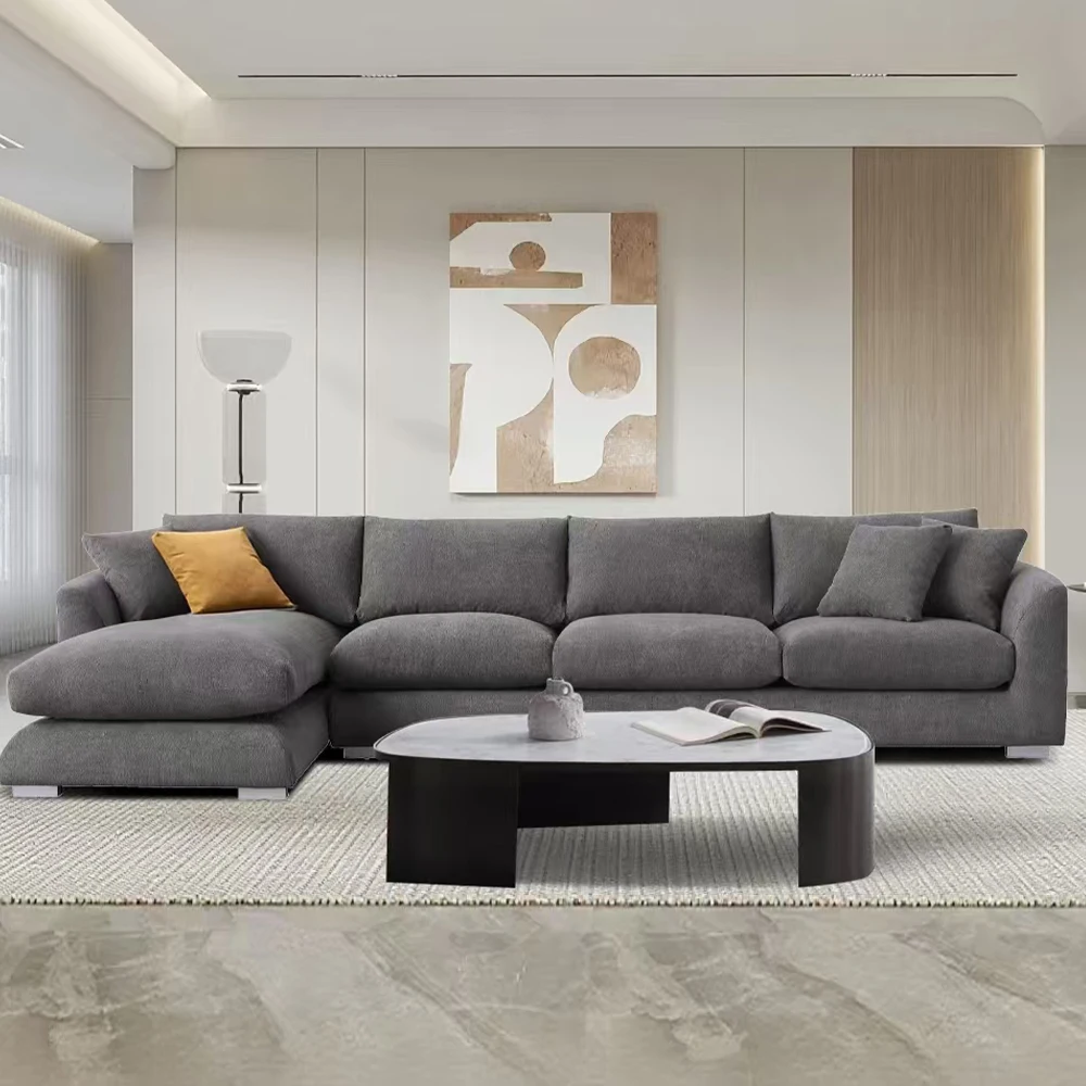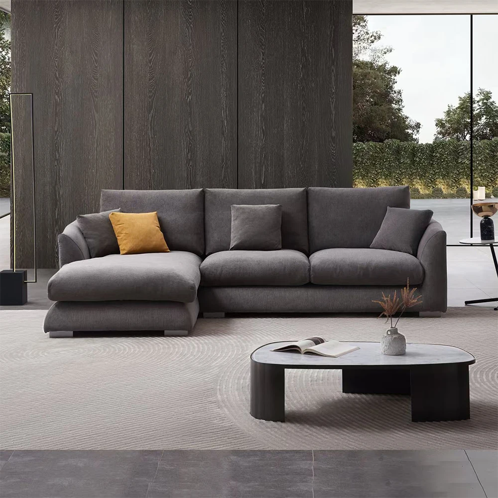 This cloud down-filled chaise sofa offers exceptional comfort and style for any living room. Its L-shaped design provides ample seating space for family gatherings or relaxing alone. Plush down-filled cushions create a soft, cloud-like feel for ultimate comfort. The recliner section allows for personalized lounging and relaxation. Upholstered in high-quality linen, the sofa combines durability with a sophisticated look. Removable and washable covers make cleaning and maintenance easy and convenient. The modern design complements a variety of home décor styles, from contemporary to classic. Sturdy frame construction ensures stability and long-lasting use. Lightweight yet robust, the sofa can be repositioned easily to suit your space. Combining luxury, comfort, and practicality, this cloud sofa transforms your living room into a cozy, inviting space.