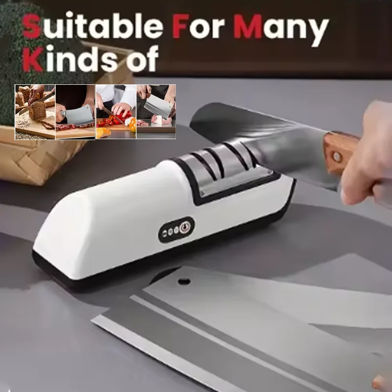 This electric knife sharpener provides fast and professional sharpening for everyday kitchen knives. Featuring a multifunctional automatic design, it restores dull blades with ease and precision. The 4-gear sharpening system is suitable for different blade types and sharpening stages. Simple one-touch operation makes it convenient for both beginners and experienced cooks. Designed for efficiency, it saves time compared to manual sharpening methods. The sturdy construction ensures stable and safe use during operation. Compact in size, it fits neatly on kitchen countertops without taking up much space. Ideal for sharpening kitchen knives, scissors, and other cutting tools depending on blade type. Durable materials ensure long-lasting performance and consistent results. This electric knife sharpener keeps your knives sharp, safe, and ready for daily cooking tasks.