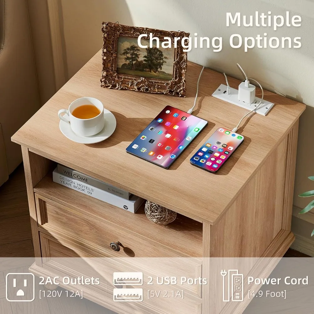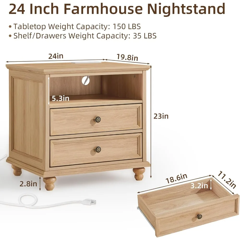 This 24″ wide farmhouse nightstand set of 2 combines rustic charm with modern functionality for any bedroom. Each nightstand features two spacious drawers for storing essentials, keeping your bedroom organized and clutter-free. Built-in charging stations provide convenient USB ports for charging phones, tablets, or other devices. Crafted from natural wood, these nightstands offer durability and a warm, classic aesthetic. The end tables complement a variety of bedroom styles, from farmhouse to contemporary. Sturdy construction ensures long-lasting stability and reliability. Perfect for placing beside beds, couches, or accent furniture, they enhance both style and function. Smooth drawer slides allow effortless access to stored items. The compact design fits well in small or large spaces alike. Combining storage, convenience, and timeless farmhouse design, this nightstand set elevates both the look and functionality of your bedroom.