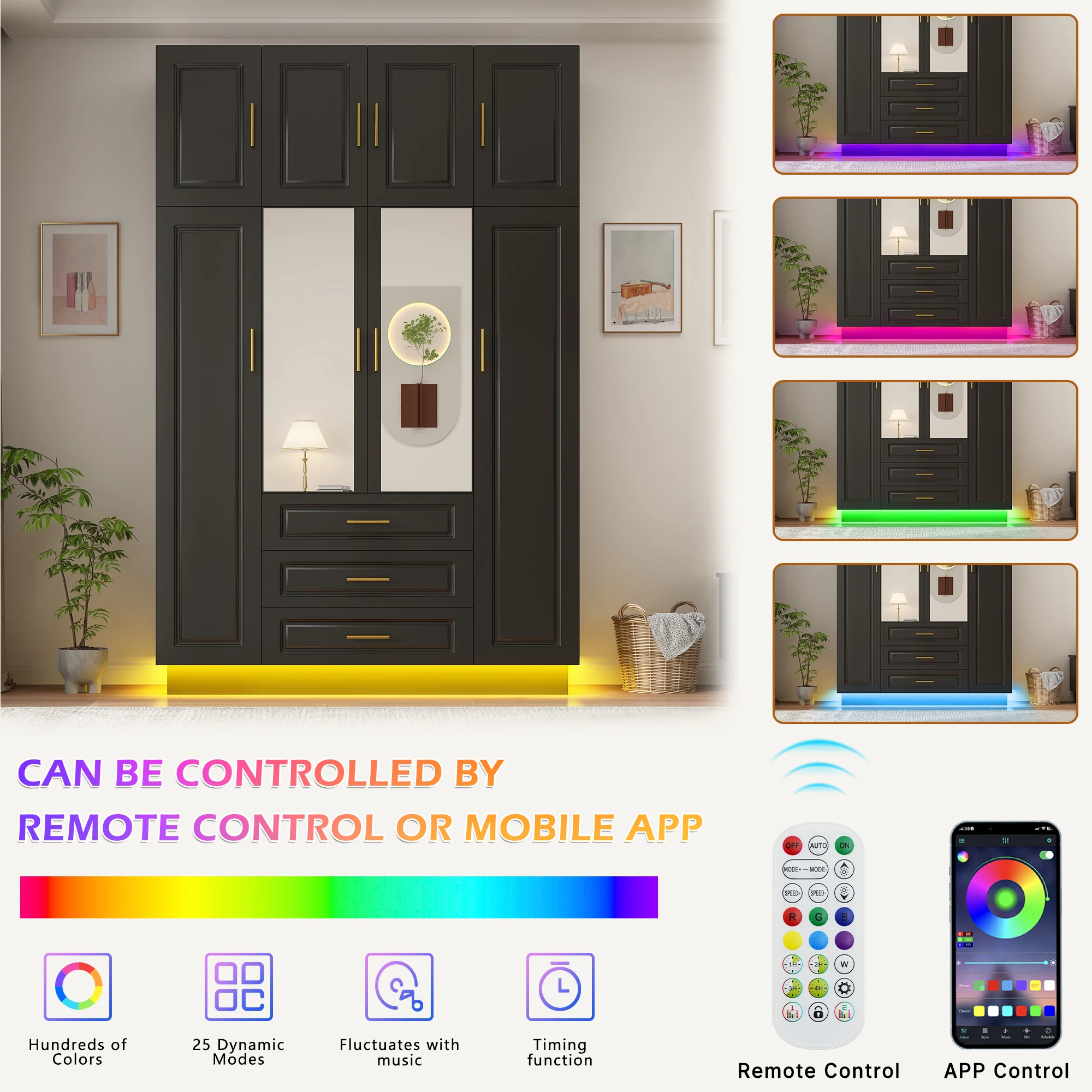 This 4-door LED armoire wardrobe combines modern design with practical storage for any bedroom. Featuring 3 drawers and a spacious hanging rod, it provides ample room for clothes, accessories, and personal items. The built-in mirror enhances convenience and adds a touch of elegance to the wardrobe. LED lighting creates a stylish and functional illumination inside the cabinet. Sturdy construction ensures durability and long-lasting stability. Ideal for bedrooms, dressing rooms, or guest rooms, it complements a variety of interior styles. The large compartments and drawers make organizing clothes and essentials effortless. Smooth drawer slides allow easy access to stored items. Lightweight yet strong, the wardrobe is easy to reposition while maintaining its structure. Combining style, storage, and modern technology, this LED armoire enhances both the functionality and aesthetics of your bedroom.
