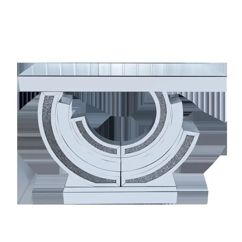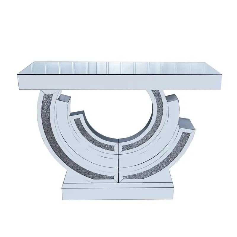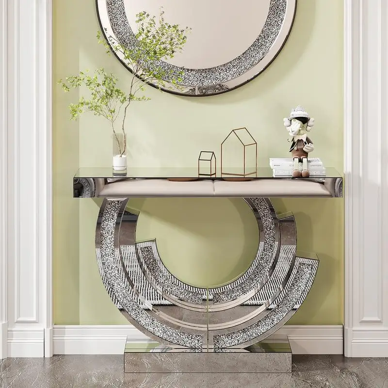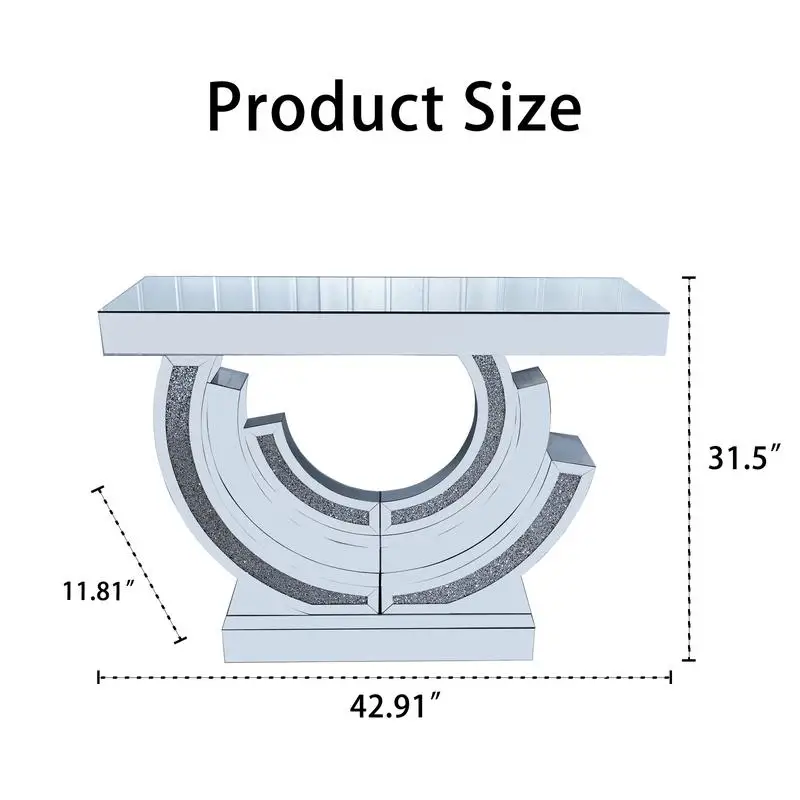This C-shaped crushed diamond mirrored console table adds luxury and elegance to any hallway or living space. Designed with reflective mirrored panels, it enhances light and creates a bright, spacious feel. The crushed diamond detailing delivers a glamorous, high-end look perfect for modern interiors. Its sleek C-shaped design allows easy placement against walls or behind sofas. Ideal for living rooms, hallways, entryways, or hotel lobbies, it serves as a stunning accent piece. The sturdy construction ensures durability and long-lasting stability. Smooth surfaces make cleaning and maintenance simple and convenient. Perfect for displaying décor, flowers, lamps, or decorative trays. The modern glam style complements contemporary, luxury, and hotel-inspired interiors. Combining sophistication, functionality, and eye-catching design, this mirrored console table elevates any space instantly.