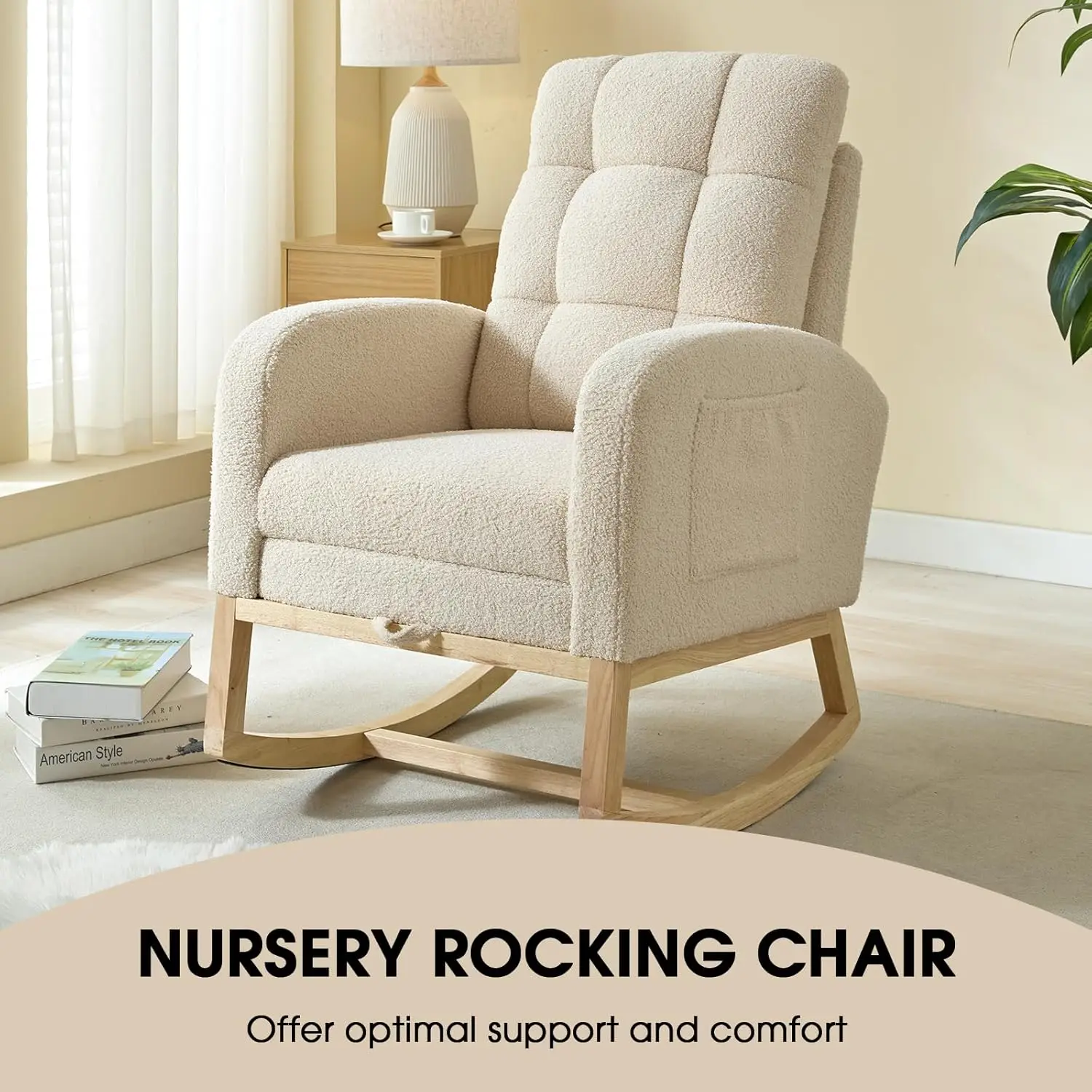 This modern teddy rocking chair with footrest provides ultimate comfort and style for nurseries, bedrooms, or living rooms. Upholstered in soft apricot fabric, it creates a cozy and inviting seating experience. The smooth rocking motion promotes relaxation for both adults and children. A built-in side pocket offers convenient storage for books, toys, or nursing essentials. The ergonomic design includes a supportive footrest for added comfort during long sitting sessions. Sturdy construction ensures durability and stability for daily use. Its compact design allows it to fit seamlessly into smaller spaces without compromising style. Perfect for nursing, reading, or quiet relaxation, enhancing any room’s functionality. Easy to assemble and maintain, keeping your space organized and comfortable. Combining practicality, comfort, and modern design, this teddy rocking chair is a versatile and stylish addition to your home.