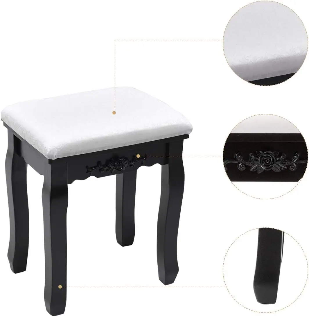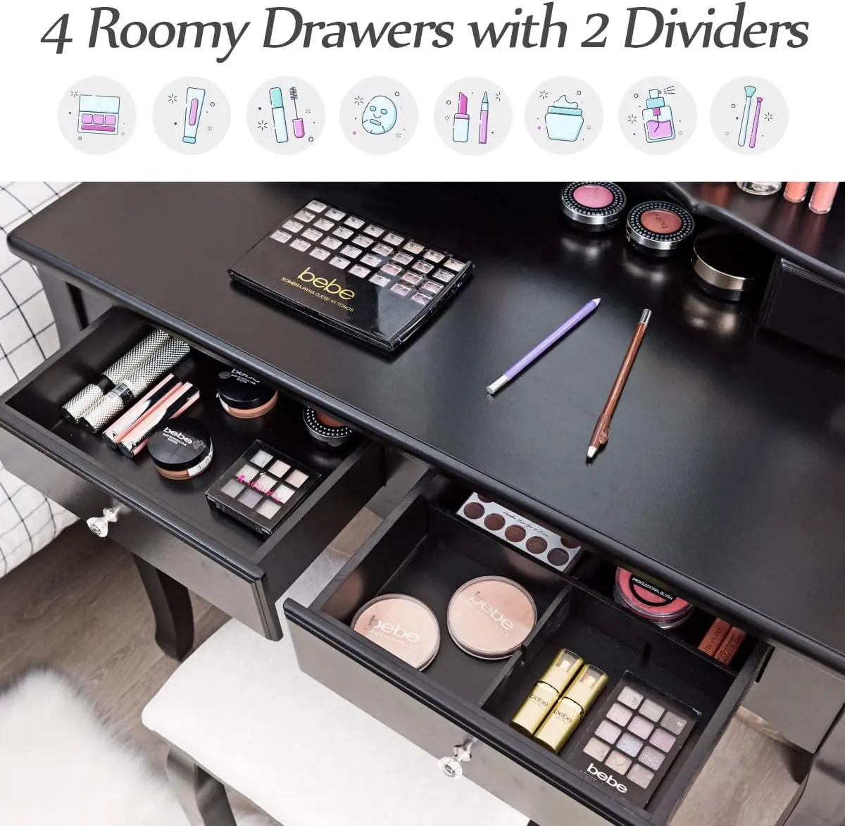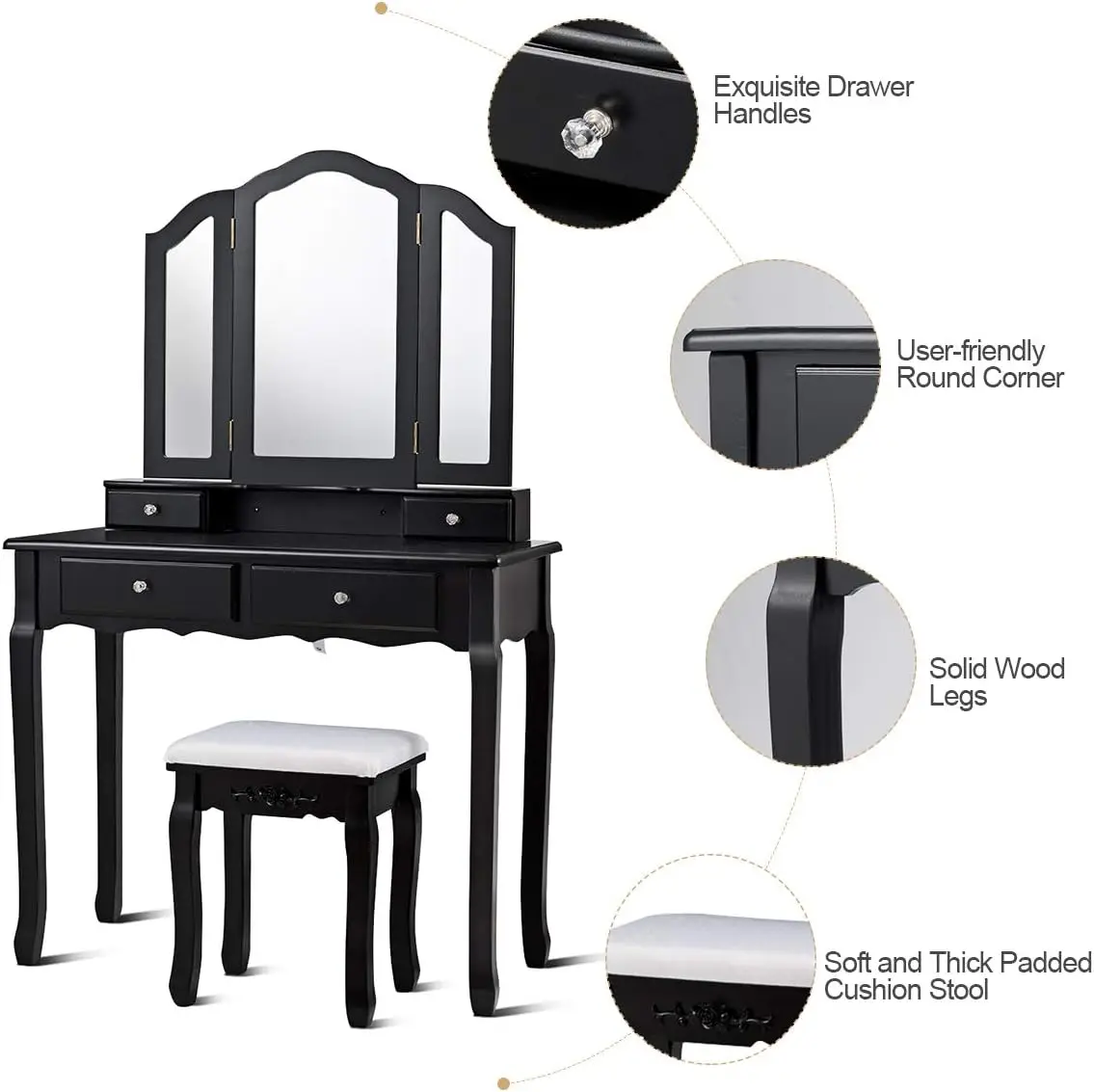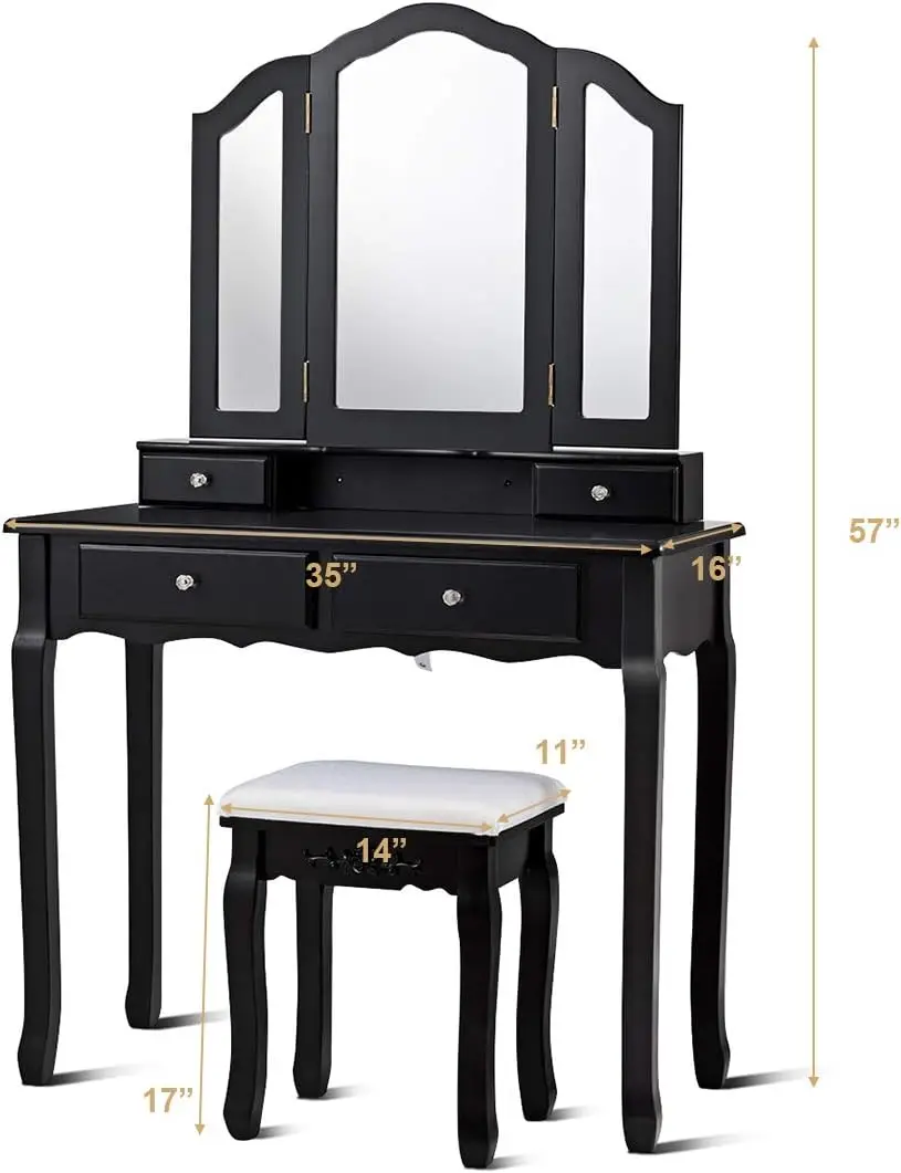 This modern vanity set combines elegance, functionality, and style for any bedroom or dressing area. Featuring a tri-fold mirror, it provides multiple viewing angles for precise makeup application and hairstyling. Four spacious drawers offer ample storage for cosmetics, jewelry, and personal accessories. The included cushioned stool ensures comfortable seating during use. Designed for girls and women, its sleek black finish complements modern and contemporary décor. Sturdy construction guarantees long-lasting durability and stability. Compact yet functional, it fits perfectly in bedrooms, apartments, or dressing rooms. Easy to assemble with clear instructions, it is convenient and practical. The minimalist design enhances your space while keeping essentials organized. Combining style, storage, and comfort, this vanity set is a perfect addition to any home.