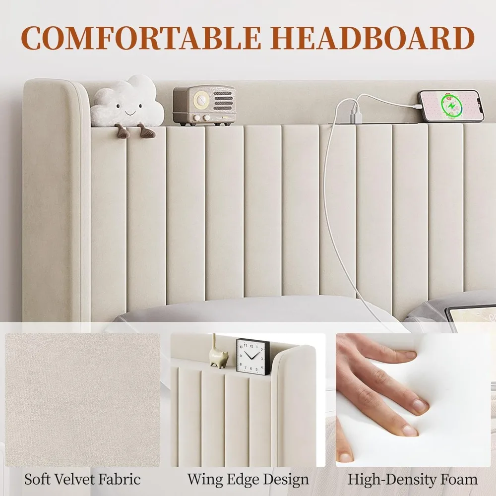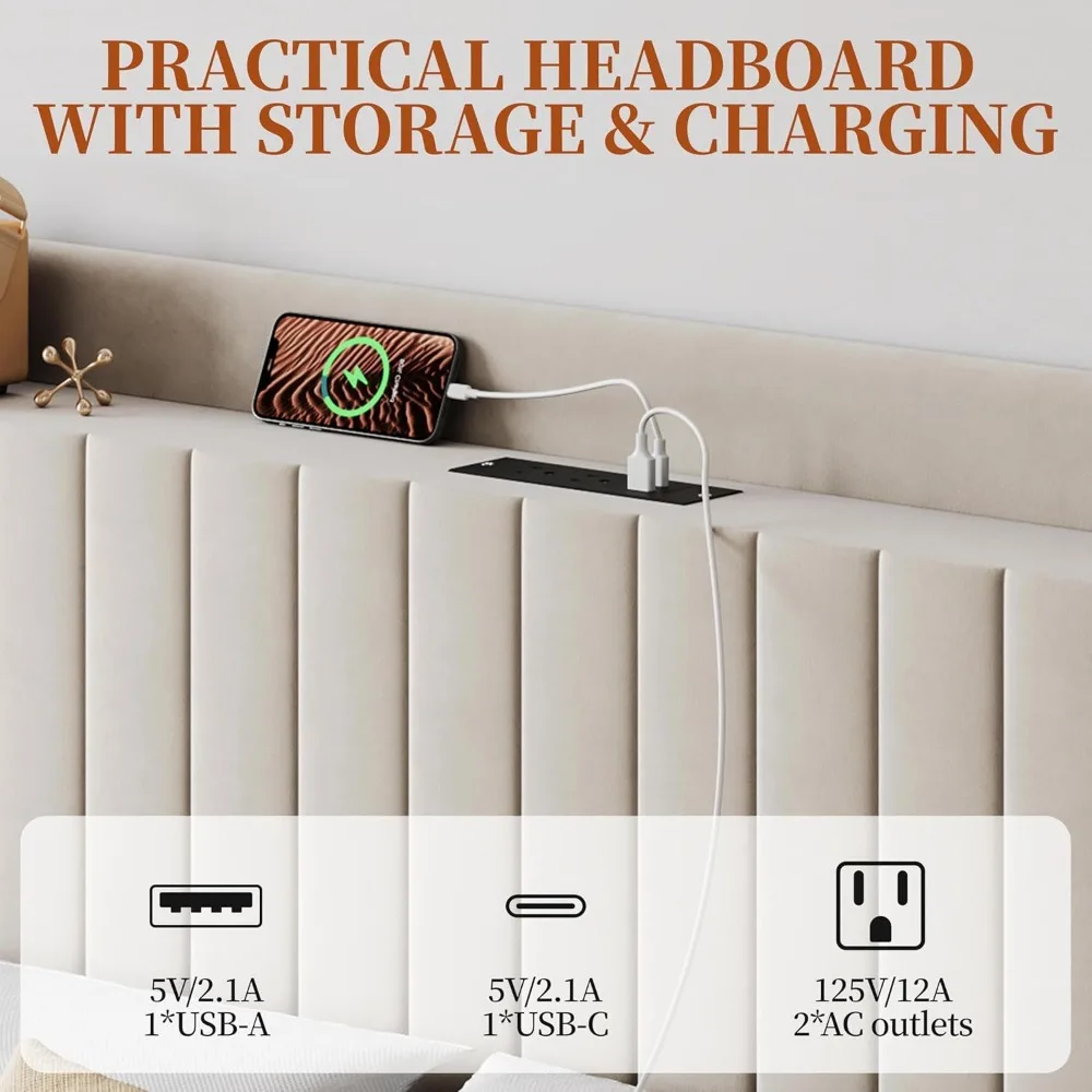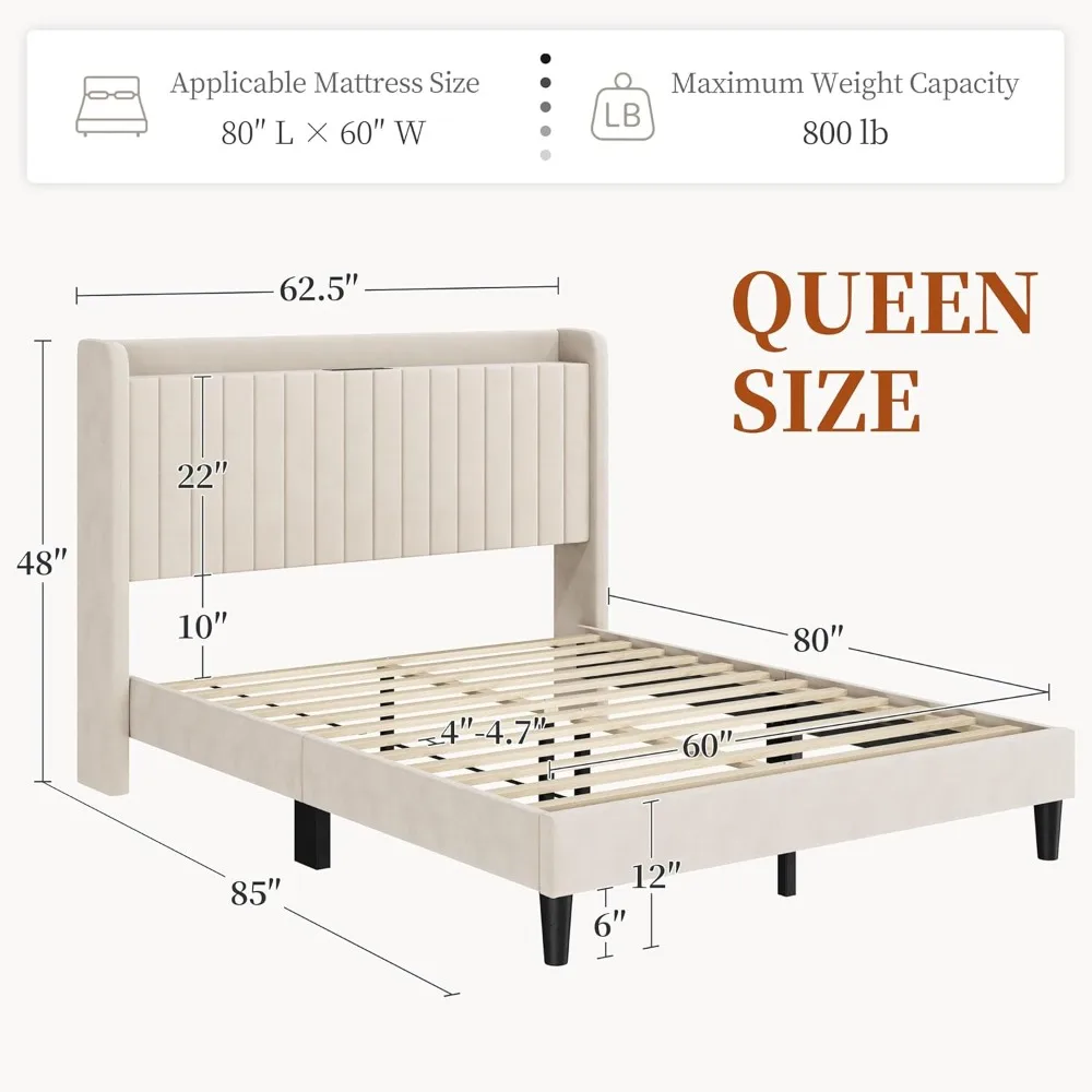 This queen bed frame combines style, comfort, and functionality for a modern bedroom. The upholstered headboard with wing sides adds elegance and a cozy backrest. Built-in USB charging ports make it easy to charge devices overnight. A convenient storage shelf provides space for books, décor, or personal items. Sturdy wooden slats ensure mattress support and durability. The platform design eliminates the need for a box spring, offering a sleek low-profile look. Ideal for bedrooms, guest rooms, or apartments, it maximizes functionality while saving space. Easy assembly allows quick setup and immediate use. The contemporary design complements a wide range of interior styles. Combining storage, charging convenience, and modern aesthetics, this queen bed frame enhances both the style and practicality of any bedroom.
