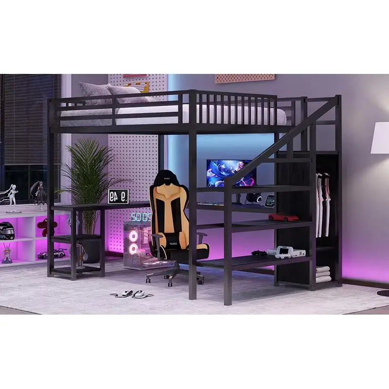 This queen loft bed with wardrobe is a multifunctional solution for kids and teens, combining sleeping, studying, and storage in one. The L-shaped desk provides a convenient workspace for homework or creative activities. Built-in LED lights illuminate the bed area, adding a fun and modern touch. The integrated USB port allows easy charging of devices. The wardrobe underneath offers ample storage for clothes and personal items, keeping the room organized. Sturdy construction ensures safety and long-lasting durability. Perfect for small bedrooms, apartments, or shared spaces, it maximizes floor space efficiently. The modern design complements a variety of room styles and décor. Easy assembly allows quick setup and immediate use. Combining functionality, style, and practicality, this loft bed set enhances both the comfort and organization of any bedroom.
