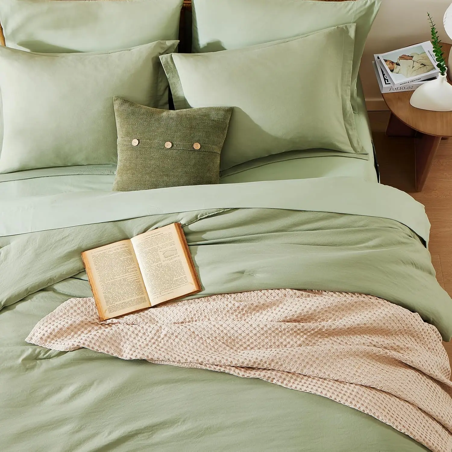 This 7-piece queen comforter set in sage green offers a complete and stylish bedding solution. Crafted from soft, high-quality materials, it provides a cozy and comfortable sleeping experience. The set includes a comforter, fitted sheet, flat sheet, and pillowcases for a full bed-in-a-bag package. Durable stitching ensures long-lasting use and retains its vibrant color even after multiple washes. The breathable fabric keeps you cool in summer and warm in winter. The calming sage green color adds a fresh and modern touch to any bedroom décor. Easy to mix and match with other accessories, it enhances your sleeping space effortlessly. Lightweight yet durable, the set combines practicality and elegance. Perfect for queen-size beds, guest rooms, or master bedrooms, it creates a welcoming and cozy atmosphere. Combining comfort, style, and convenience, this bed-in-a-bag set elevates any bedroom.